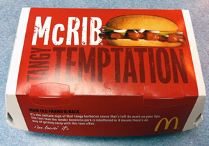 I knew very little about the McRib – other than it was oval, it was slathered with bar-b-que sauce and there were “bones” pressed into it. I had never been able to wrap my brain around this “pork” bar-b-que sandwich – and what pressed in “bones” meant. I was afraid of what I didn’t know. I was afraid to go into the night. Into the dark, dark, darkness.